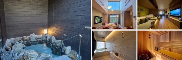 すべての客室には、自家源泉を堪能できる風呂やサウナ(※)、開放的なテラス、家電や調理器具等が付いたキッチンなど充実した設備を用意。さらに、2階建てメゾネットタイプの客室のうち5室には、岩造りの専用露天風呂やサウナ、外気浴スペースを備えた離れを設け、非日常の体験を満喫することができる。