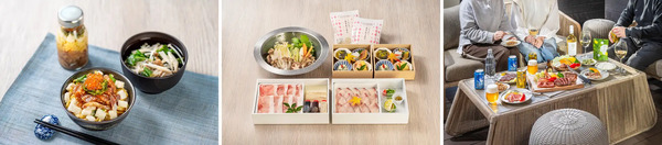 (左)朝食の「りゅうきゅう丼」/(中央)夕食の「しゃぶしゃぶ」/(右)テラスで楽しむ「鉄板焼き」
