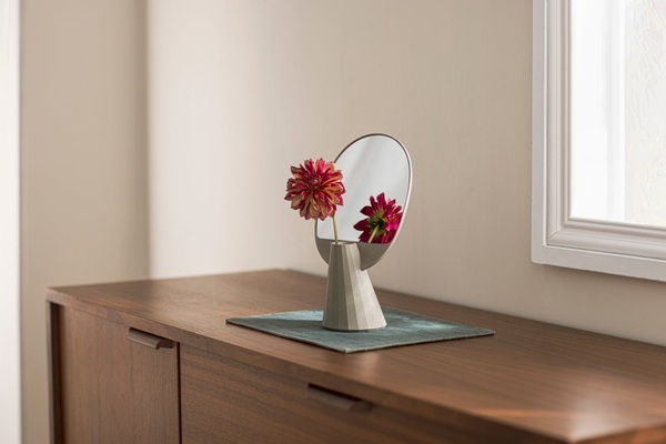 「Mirror & vase」は、傾斜のあるミラーが花全体を映し、空間をより華やかに見せてくれるフラワーベース。付属の小さな台を付ければ、お気に入りのアクセサリーやリップを置いて、お出かけ前のメイク時間に使いたいミラーになる一台二役。