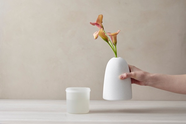 「Flower vase」は、石のように穏やかな外観と、陶器を思わせるしっとりとした質感。緩やかなカーブを描くフォルムは、主張しすぎずに花を引き立てる。カバーとカップとストレーナーにより、活け直さずに水替えができる細やかな工夫を施した。