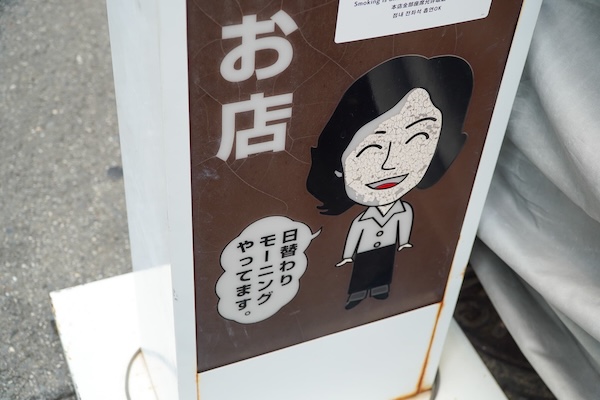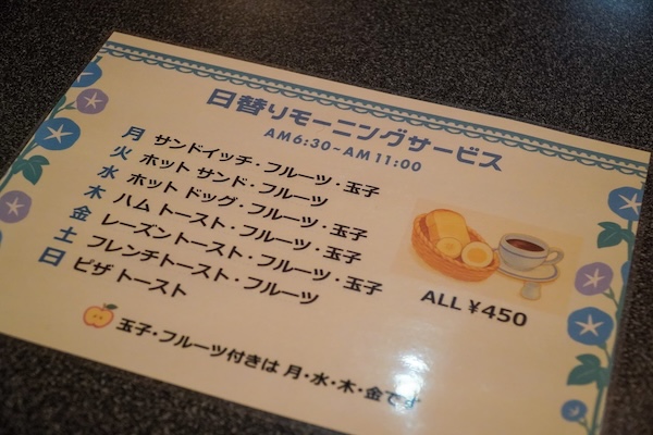 モーニングのメニューがずらっと曜日ごとに書かれたボード。月火水木金土日。あれ、定休日がない。
