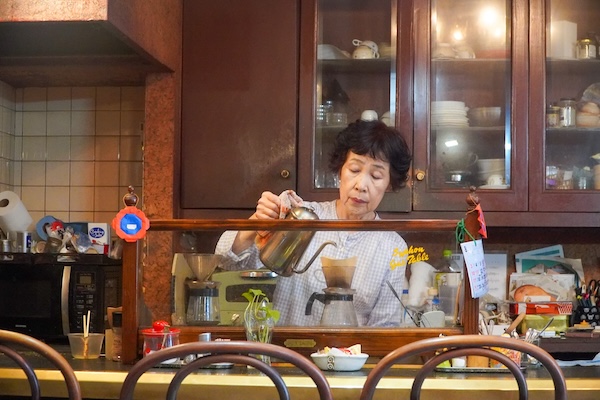 注文を受けてから、丁寧に一杯ずつドリップするママの姿。銀のポットから、トロリトロリと注がれるお湯の音。漂ってくる香りと、その動きに、つい見とれてしまう。