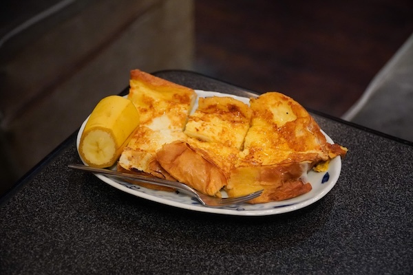 この日のモーニングは、たまごサンドとフルーツ、半熟のゆで卵。「今日はこれね」と笑って渡されるトレイには、過不足のない朝が詰まっていた。