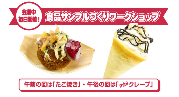 時間は各日10:00〜12:00と13:30〜15:30で、所要時間は20分程度。午前の回は「たこ焼き」、午後の回は「miniクレープ」を作る。参加チケットは500円(税込)で、定員は各回50名。参加チケットは、当日9:00〜会場にて先着順で販売。定員になり次第、販売終了となる。