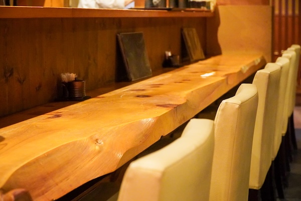 カウンターに腰を下ろす。分厚い一枚板は、どっしりと静かで、でもどこかやわらかい。