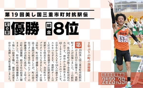2月15日(日)に開催された第19回 美し国三重市町対抗駅伝において、菰野町チームが町の部で優勝。2年ぶりとなる栄冠を手にした大会の様子を、写真とともに掲載している。