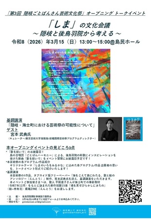 ごとばんハーモニーによる「歌を紡いで」の披露や、全プログラム・作品の紹介、特別基調講演「隠岐・海士町における芸術祭の可能性」が予定されている。基調講演ゲストは、キュレーター/東京藝術大学准教授/前橋国際芸術祭2026プログラムディレクターの宮本武典氏。