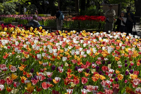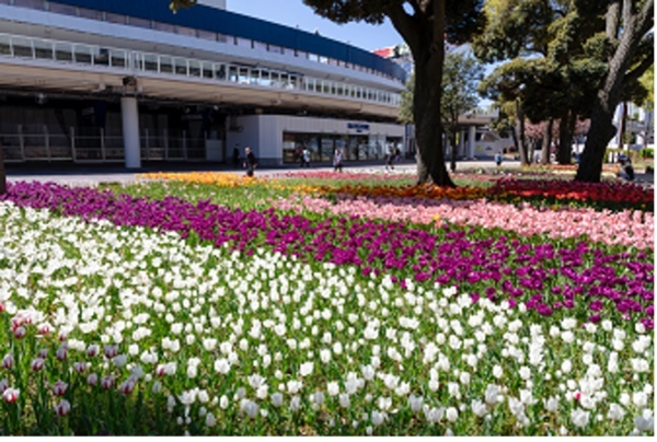 チューリップの時期は、4月上旬〜4月中旬。横浜公園では、色鮮やかな約10万本のチューリップが咲き誇る。横浜公園から横浜港へ続く400mの日本大通りでは、チューリップの花回廊が春を彩る。
