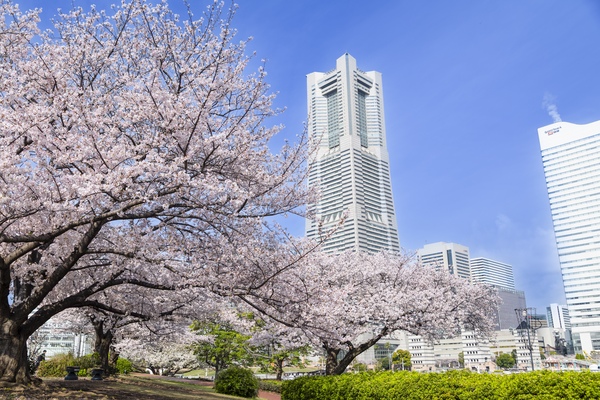 運河と横浜ランドマークタワーや大観覧車を眺めながら散策できる、汽車道等にも桜が咲き誇る。