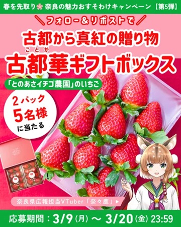 奈良県では、県広報担当VTuber「奈々鹿(ななか)」の公式Xアカウントを活用し、SNS連動型のプレゼント企画「奈々鹿から皆さまへ!奈良の魅力をおすそわけキャンペーン!」の第5弾を実施している。期間は、3月9日(月)~20日(金)23時59分だ。