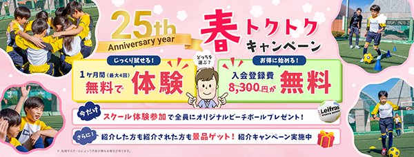 子ども向けスポーツスクールの運営や部活動地域展開支援などを行うリーフラスは、リーフラススポーツスクールで実施中の「どっちを選ぶ?春トクキャンペーン」をパワーアップさせた、「春トクトクキャンペーン」を開始。
