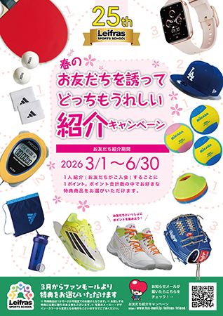 友達を紹介し、紹介した人が入会した場合、紹介してくれた人、紹介された人どちらにも豪華賞品をプレゼントする。仲良しの友達と一緒なら、初めての習い事も安心。友達と一緒におトクに始めてみては。