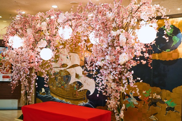 桜のフォトスポットは、両側に枝垂れ桜を設え、桜のアーチをくぐるようなデザインに。優美に咲き誇る桜のアートフラワーをぼんぼりの柔らかな灯りで照らし、春の情緒あふれる空間を演出している。