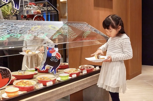 館内のレストランには、子ども用メニューや朝食時のキッズビュッフェカウンターがあり、家族での楽しい食事時間を演出する。