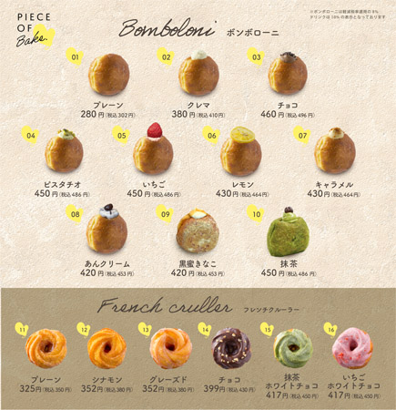 「Bomboloni(ボンボローニ)」は、「プレーン」302円、「クレマ」410円、「チョコ」496円、「ピスタチオ」486円、「いちご」486円、「レモン」464円、「キャラメル」464円、「あんクリーム」453円、「黒蜜きなこ」453円、「抹茶」486円の10種。
