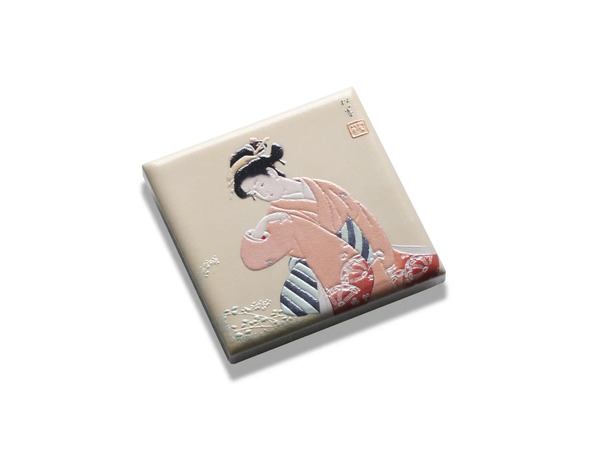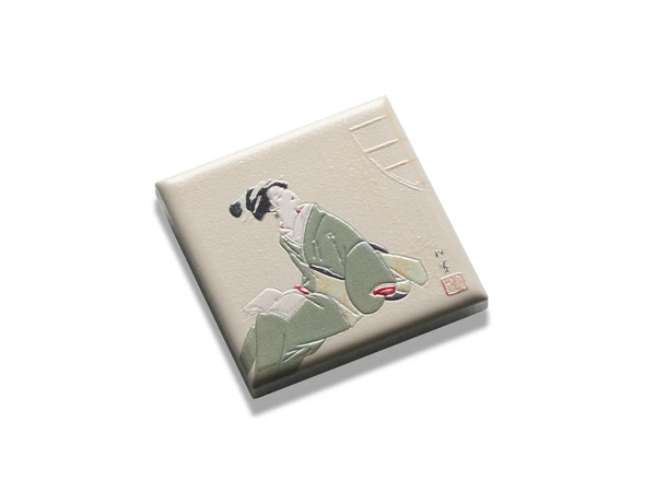 女性の優しい表情や着物のシルエットは、丸みのある起伏で立体的に表現。丸窓の外に広がる景色まで想像がふくらむ、穏やかな時間が閉じ込められている。