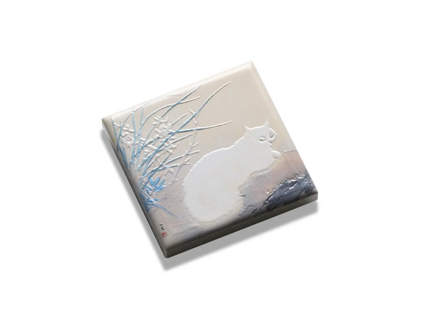 橋本関雪『春昼(1944年)』は、翡翠のような目を見開き、岩上に静かに横たわる美しい白猫が描かれている作品。マグネットでは、やわらかな毛並みを感じる猫のフォルムが引き立つように、墨の濃淡に合わせたグラデーション状のなだらかな起伏をつけて、シルエットが浮かび上がるように仕上げられている。