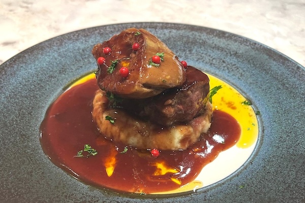 フォアグラのソテーと黒毛和牛のステーキを赤ワインベースのトリュフソースで仕上げた「フォアグラとステーキ」2,420円(税込)。小皿料理や、フレンチの技法を使った料理をワンハンドで楽しめる串焼きなど、小ポーションのメニューも豊富にそろえ、おひとりさまや2軒目使いとしても利用しやすい。