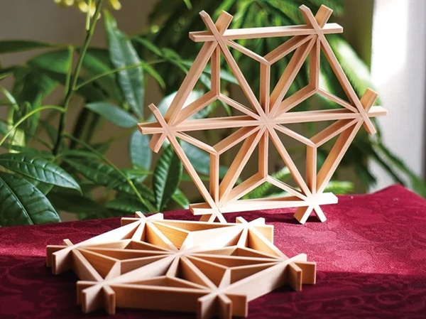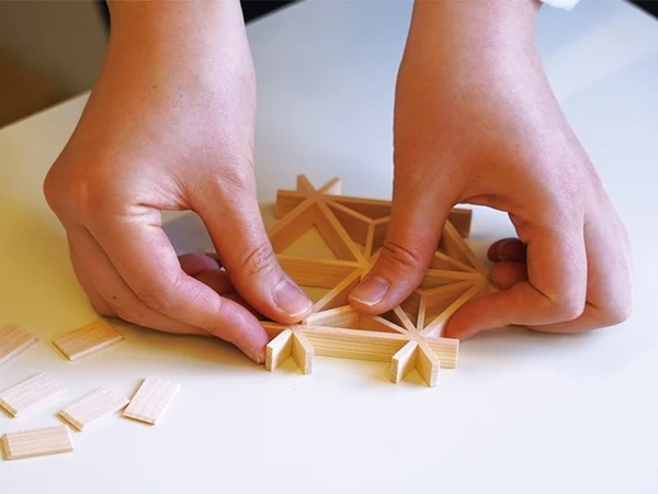 富山県砺波市の老舗建具店「河島建具」と連携し、日本の伝統的な木工技術「組子」を体験できるワークショップも開催。組子は釘や金具を使わず、細い木の桟を精巧に削り組み合わせて幾何学文様を生み出す日本建築の伝統技法だ。