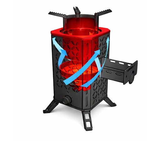 「焚神ストーブ」には、送風ファンを内蔵。三重壁構造により空気の流れを最適化し、底部の通気孔から酸素を供給、上部の通気孔で二次燃焼を促進する。