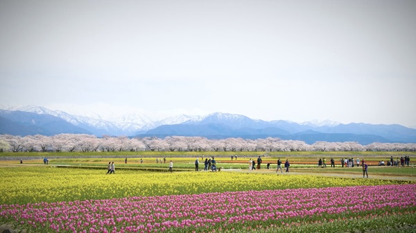 「春の四重奏」は、残雪の北アルプス・桜並木・菜の花・チューリップという4つの春の色彩が一つの景色に重なる、全国的にも珍しい景観といえるだろう。