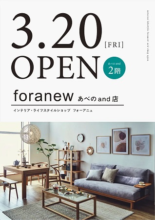 “すべての人に、幸せな時間と空間を。”をミッションに掲げ、インテリアショップ「foranew(フォーアニュ)」および「LEEPH」を運営するコラボスタイルが、3月20日(金)、大阪・阿倍野の商業施設「あべのand」2階に、新店舗「foranew あべの店」をオープンする。