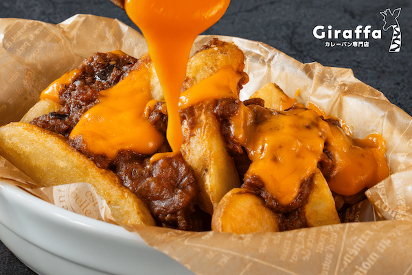 「ジラッファ流プーティン」は、ホクホクのフライドポテトに濃厚チーズソースと特製スパイスを絡めた一品。カレーパン専門店ならではのコクと深みが特徴だ。
