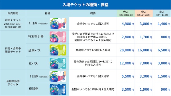 券種により販売期間、入場可能日や時間が異なるため注意が必要だ。