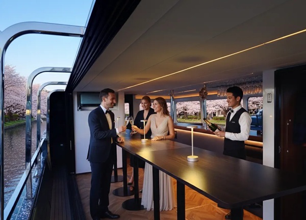 シャンパーニュなどのドリンクを楽しみながら、満開の桜のトンネルをゆったりとクルージング。混雑する川沿いとは違い、落ち着いた空間で桜を鑑賞できる新しい花見体験として人気が高まっているという。