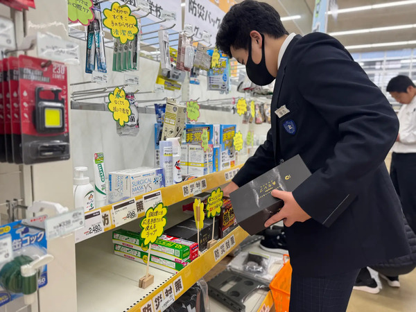 商品選定にあたっては、避難生活を想定し「本当に必要なものは何か」を生徒自身が議論して、実際の店頭商品を確認しながら構成を検討したという。