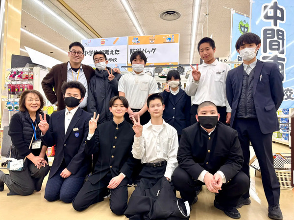 防災売場を作成した中間南中学校の生徒と先生