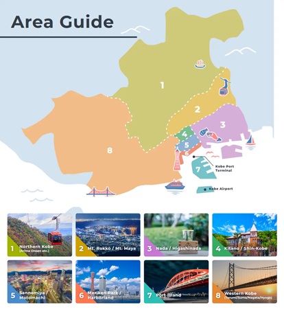 さらに、回遊を促すエリアガイドを掲載している。六甲山/摩耶山、北野/新神戸など、市内エリアを8つに分け、それぞれの特徴を写真付きで詳しく紹介。