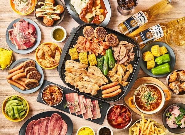 「肉食べ放題BBQビアガーデン」は、バリエーション豊かなBBQメニューが特徴。牛・豚・鶏をはじめ、「ねぎ塩タン」も食べ放題。プルコギやタッカルビ、子どもに人気のミニハンバーグやソーセージ、大人から子どもまで人気の鉄板で仕上げる「焼きそば」まで、幅広くラインナップしている。