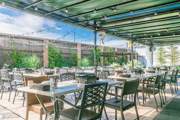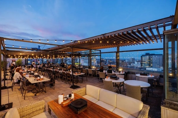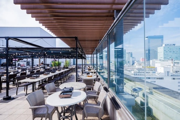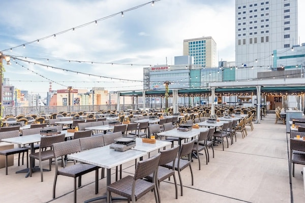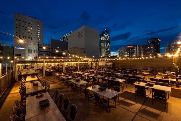「肉食べ放題BBQビアガーデン アトレ川崎店」は、JR川崎駅直結の開放的な屋上テラスにある。屋根付きエリア併設で、天候を気にせず手ぶらBBQが楽しめるのが特徴。