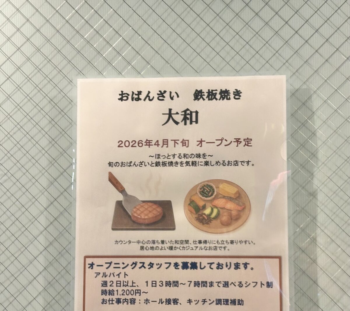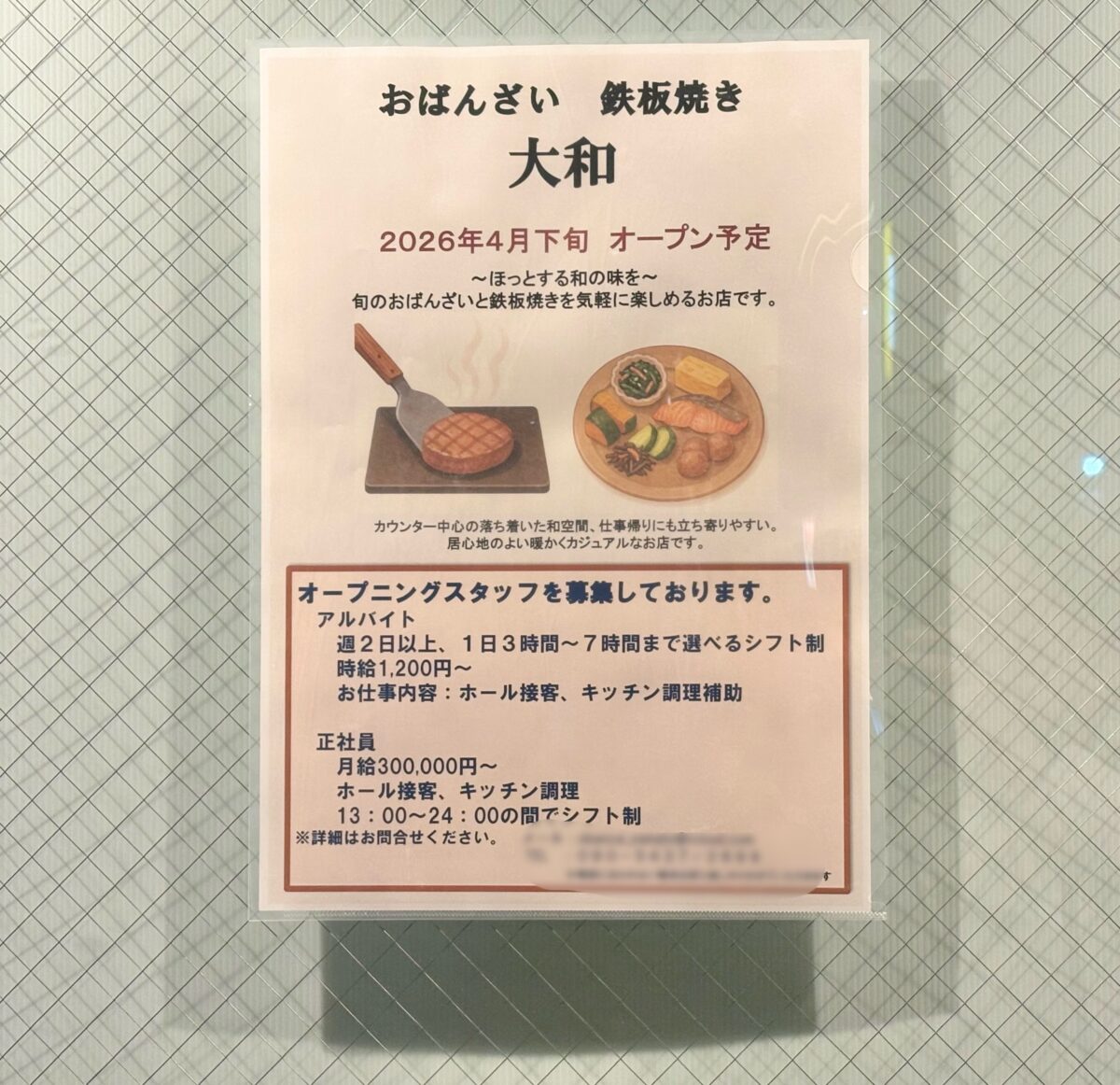 「おばんざい 鉄板焼き 大和」さんについて、今のところ詳しい情報はないのですが、オープン時期が4月下旬予定。