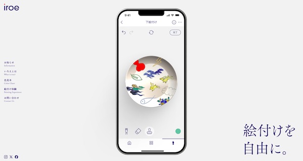 絵付け体験アプリ「いろえ」は、伊万里・有田焼の伝統的な和の美しさと、デジタルならではの手軽さを融合させた絵付け体験アプリだ。真っ白な素地の器にオリジナルデザインが描け、釉薬独特の光沢や、筆運びによって変わる色の濃淡がリアルに再現されているため、工房で職人体験をしているような没入感が味わえる。
