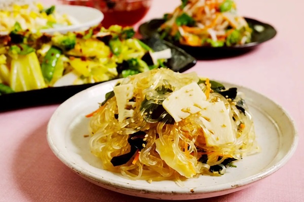 「たけのことわかめの和風春雨」は、旬のたけのことわかめを合わせた、春らしい和風仕立ての春雨。出汁の旨みをしっかりと効かせ、さっぱりとした味わいの中に素材の風味が広がる。アクセントにほんのり香るごま油が全体の味をまとめており、後味は軽やかで食べやすい。