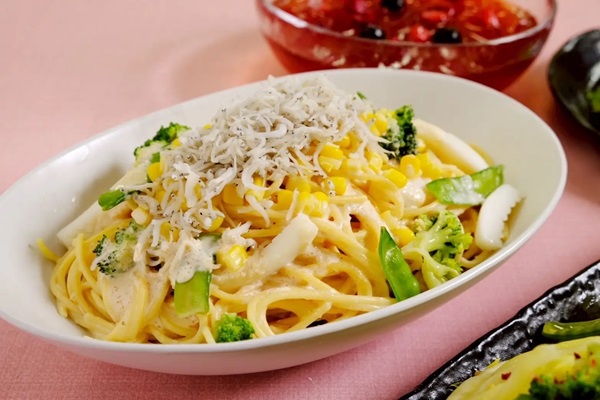 「しらすとイカの明太チーズクリームパスタ」は、明太子のほどよい塩味とピリッとしたアクセントと、チーズのまろやかなコクが重なった、満足感のあるパスタ。しらすの旨味とイカのやわらかな食感も楽しめる。