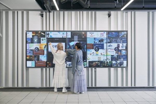 新校舎のインタラクティブボードには、学生が制作した作品が画面いっぱいに並び、画面タッチで検索したり、動画や画像を閲覧したりできる。「いつかこんな作品を自分も作りたい」「自分の作品をここに載せたい」。そんな気持ちが芽生える場所となっている。