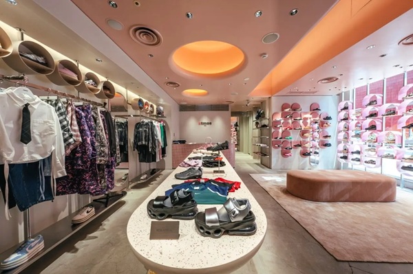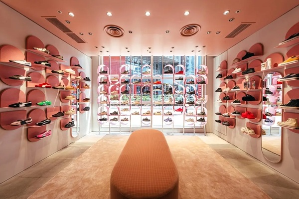 店内は落ち着いたピンクを基調とし、唯一無二の円形デザインが特徴のスニーカーウォールや、Head to toeでスタイリングをイメージできるアパレルウォールを設置。ゆっくりと買い物が楽しめるような大きなソファも用意され、ブティックのような空間となっている。