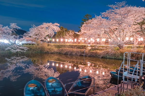 篠山城跡は、県下屈指の桜の名所として知られ、城下町に約1000本のソメイヨシノが咲き誇る。開花期間中は、ぼんぼりが点灯され、夜桜見物を楽しめるほか、堀に映る桜も見事で、辺りは幻想的な雰囲気に包まれる。