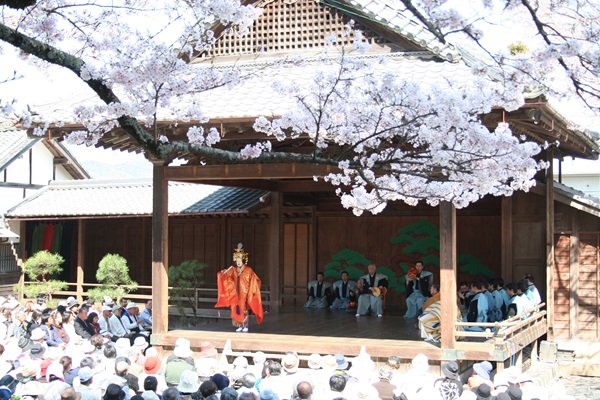 国重要文化財である春日神社能舞台は、幕末の1861年に建立された。建設当時、箱根以西では最も立派だといわれた能舞台で、舞台の床下には、音響効果のために丹波焼の大甕が7つ据えられているのが特徴だ。毎年4月の第2土曜日(今年は4月11日)には、この能舞台で能と狂言が披露される。花吹雪の中、幽玄な世界を楽しめる。なお、観覧にはチケットが必要だ。