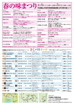 4月4日(土)10時~20時・5日(日)10時~16時には、丹波篠山市役所前で「春の味まつり」が開催される。丹波篠山の人気飲食店が勢ぞろいし、食の宝庫、丹波篠山のうまいもんが大集合する。また、丹波焼の器や、手軽にDIYに使える天然木材市も登場する。車でないと訪れることができないような丹波篠山市郊外にある人気店も城下町に集合するので、普段は手に入りにくい商品もこの日なら気軽に購入することができる。