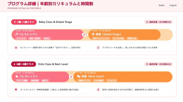 2歳~5歳クラスは15:30~16:20がバレエで16:30~17:20が英語。約2時間の連続プログラムとなっている。6歳~8歳クラスは16:30~17:30がバレエで、17:40~19:10が英語。約2時間40分の連続プログラムとなっている。