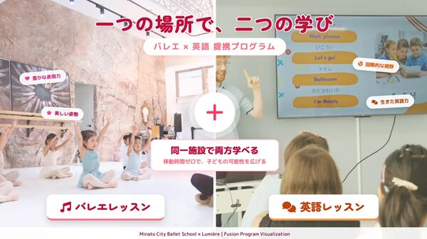 LaBALLが運営するみなとシティバレエスクールは、共働き家庭のニーズに応える新たな習い事モデルとして、ルフレとの連携により、バレエと英語を同一施設内で受講できる教育サービスを提供する。