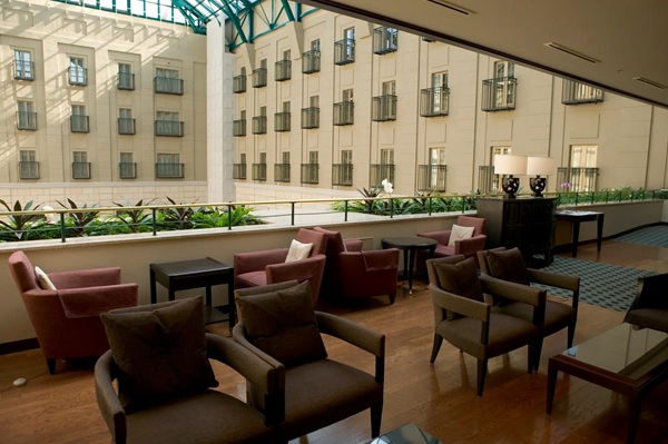 宿泊者限定ラウンジにて、ホテル自慢の中庭を眺めながら、ウェルカムドリンクサービスとともに楽しむこともできる。