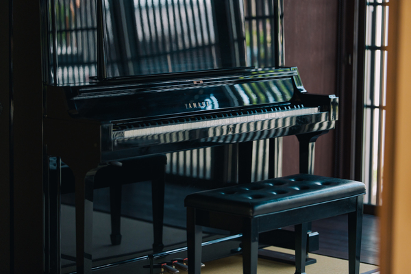 リビングには調律済みのアップライトピアノが設置されており、家族や友人とのミニコンサートなど、自由な過ごし方ができる。