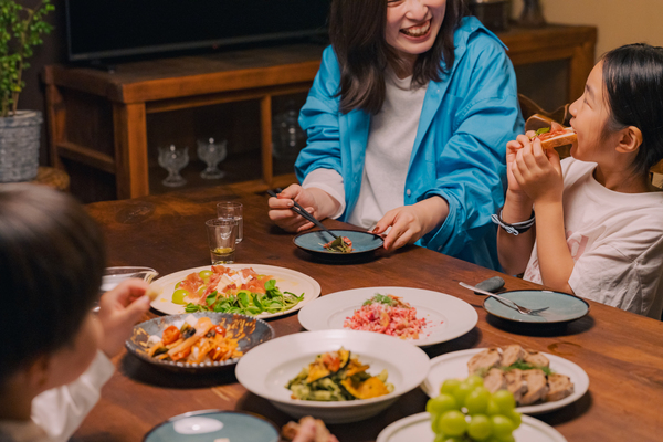広々としたリビング・ダイニングは、無垢床と和畳を組み合わせた設えで、家族や友人と自然に会話が生まれるような空間だ。