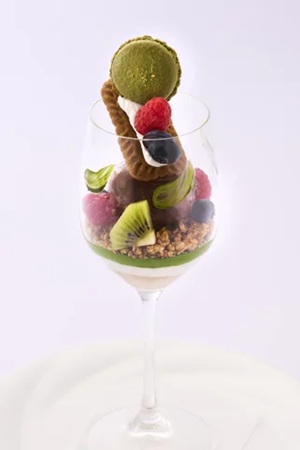 「スイス絵画の異才 カール・ヴァルザー 世紀末の昏き残照」展から着想を得た、芸術的で華やかな限定コラボパフェも登場。展覧会のイメージカラーであるグリーンを、抹茶マカロン・ピスタチオソースで表現し、濃厚なチョコレートアイスクリームとフルーツを合わせている。アート鑑賞の余韻に浸りながら、視覚と味覚でもアートを体感しよう。なお、コラボパフェの販売期間は、4月21日(火)~6月21日(日)だ。