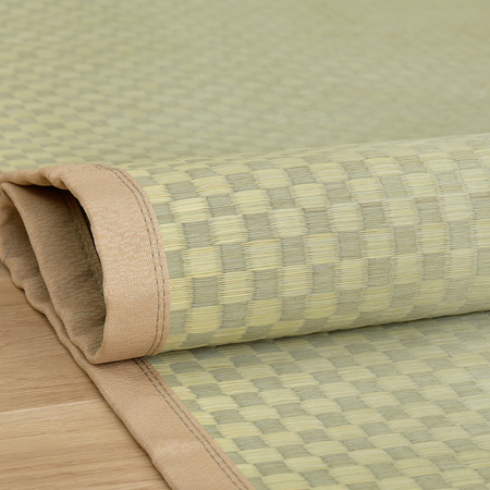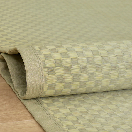 い草の打ち込み本数が多く丈夫な織り方で、い草の根っこの方になるほど白っぽく、中央部分が緑色になる特性を活かし、市松柄で織り上げている。ござの両端に向かって白っぽく、柄がくっきりと見えるグラデーションが美しい仕上がりとなっている。
